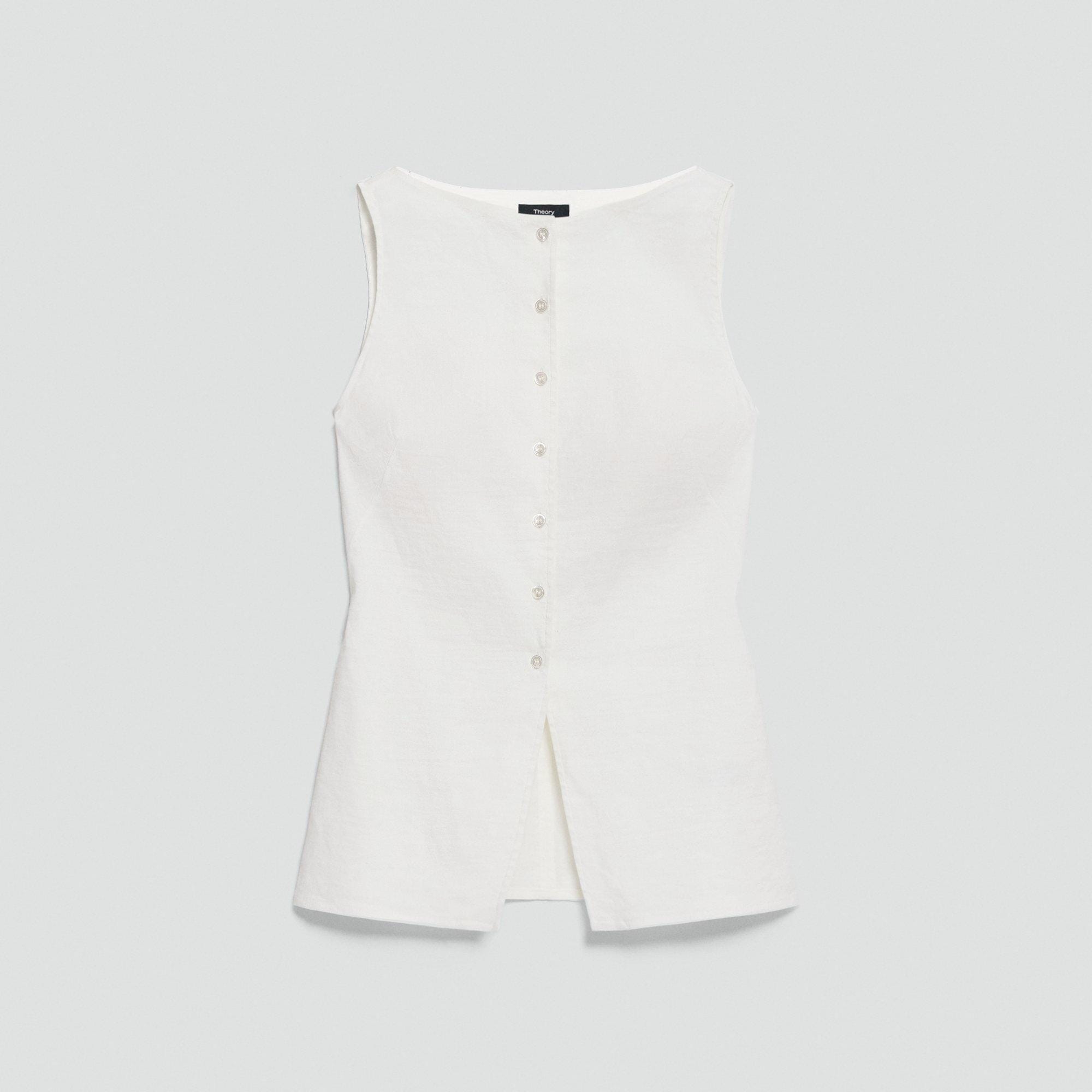 This sleeveless top is detailed with a wide boat neckline. Buttoned up the front, the silhouette slightly cinches at the waist and cuts away at the hem. It’s cut for a slim, tailored fit that pairs well with shorts, denim, or a dress pant. Crafted in our signature stretch Good Linen for all-day ease.